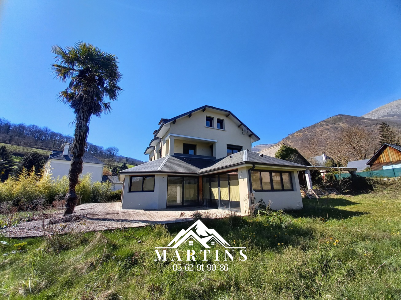 En rez-de-jardin : une grande entrée, véranda avec grandes baies vitrées donnant accès sur une terrasse et sa vue panoramique !! une cuisine ouverte aménagée,