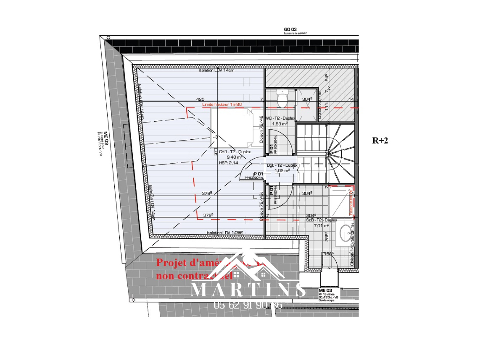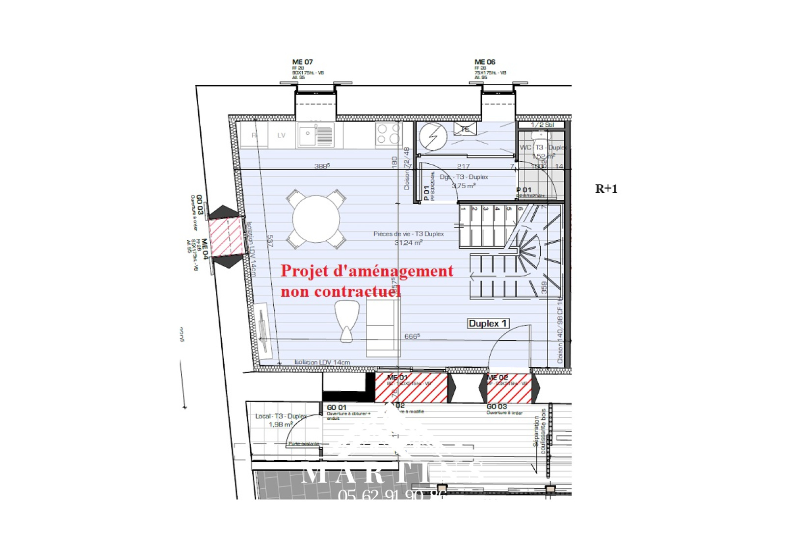 D'une surface brute de 68m² environ (et 85m² au sol), en duplex, il est situé au 1er et dernier étage de la résidence.