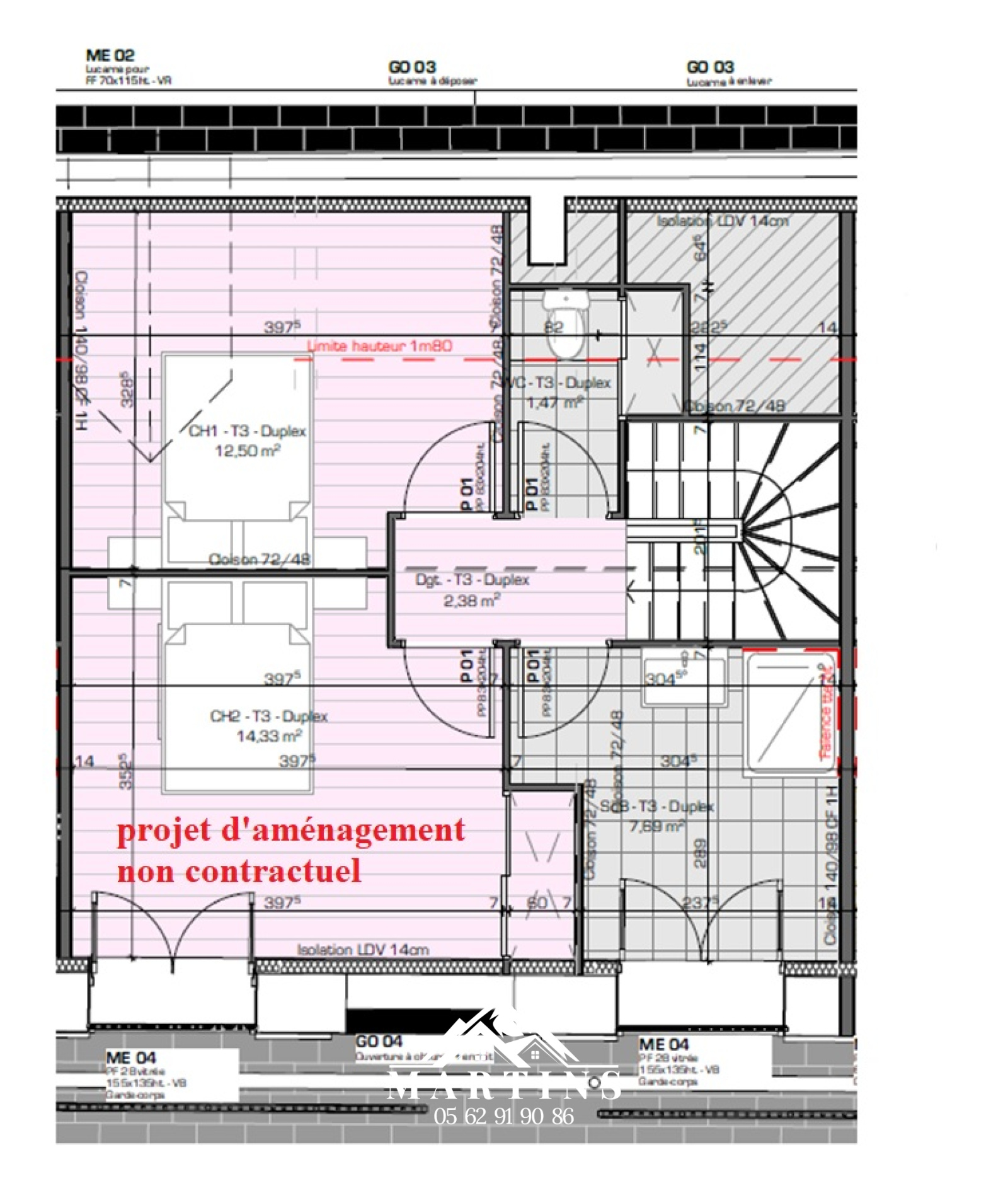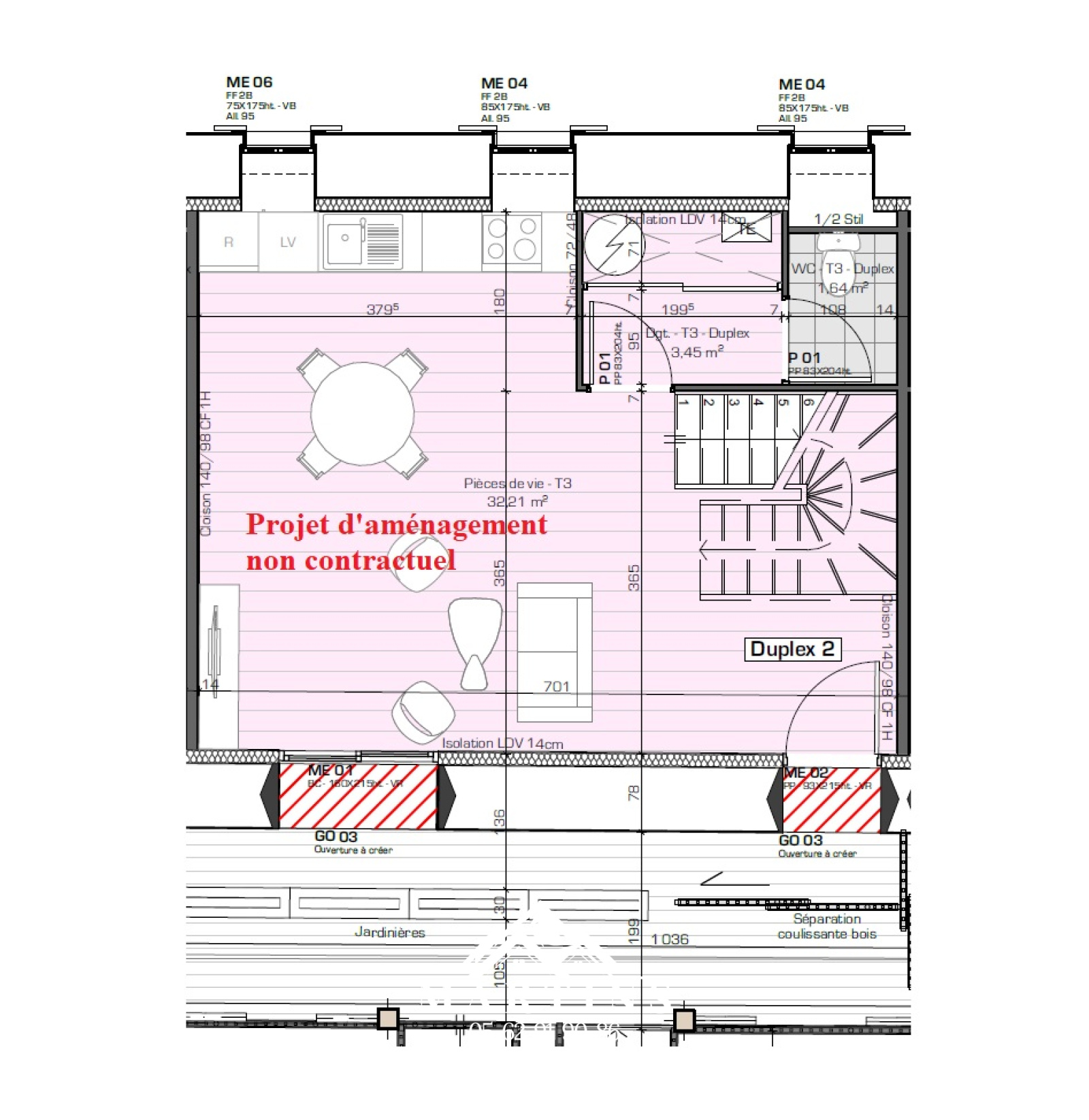 D'une surface brute de 95m² environ (et 100m² au sol), en duplex, il est situé au 1er et dernier étage de la résidence.