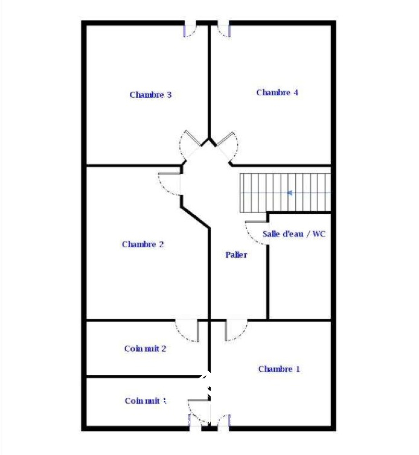 A l'étage, mansardés, 4 chambres, un espace dressing/bureau et salle de bains avec WC.
