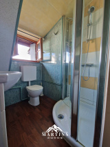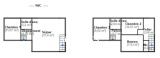 En rez-de-chaussée : une pièce de vie avec cuisine équipée ouverte et poêle à bois, une chambre et une salle d'eau avec WC.