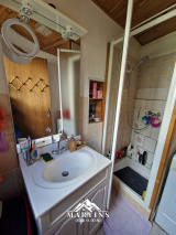 Edifiée en pierres et d'une surface de 70m² habitables environ sur 2 niveaux, cette ancienne grange en pierres comprend en rez-de-chaussée : pièce de vie avec coin kitchenette et insert bois, salon, salle d'eau, cellier et WC.