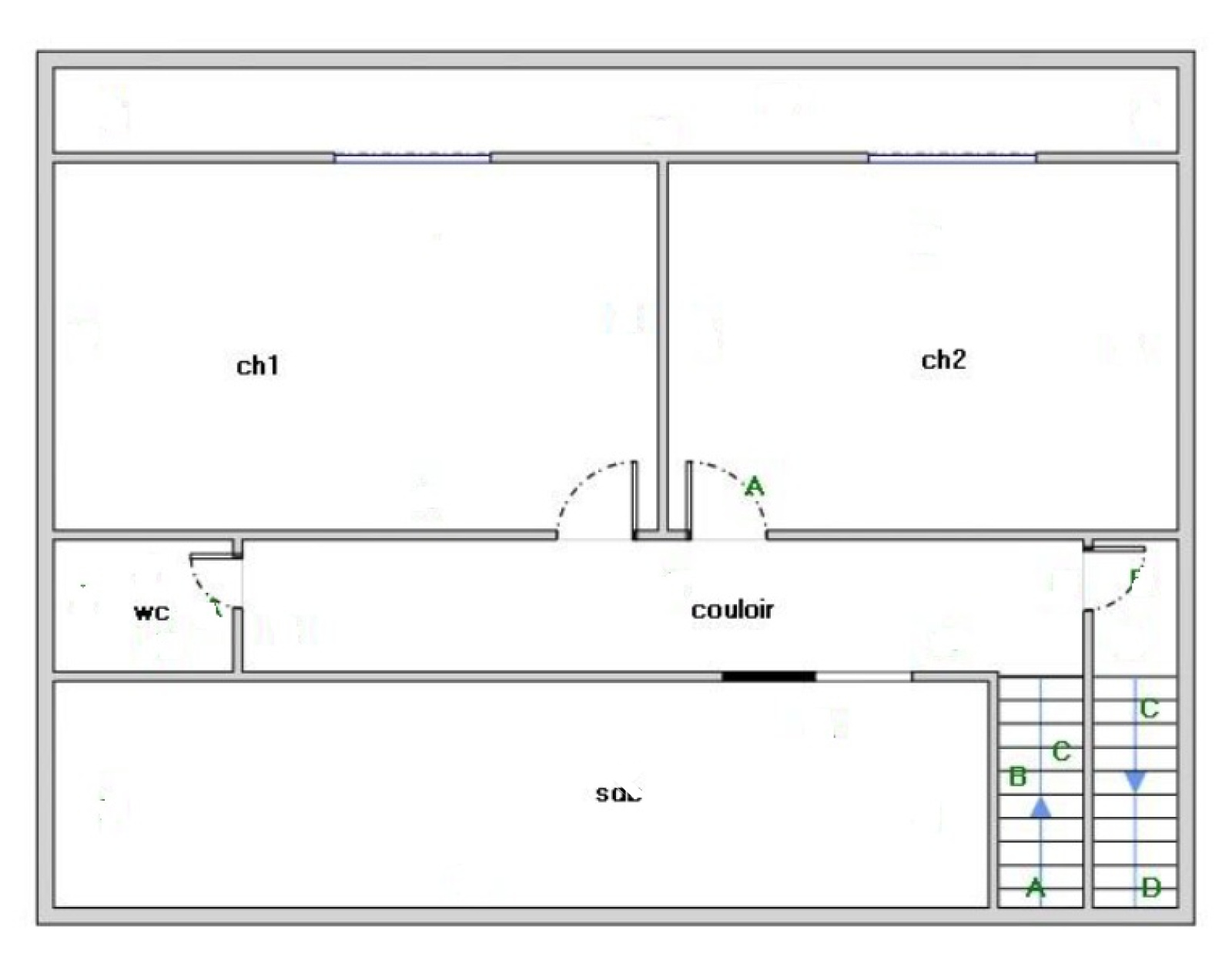- Au deuxième étage : un couloir dessert 2 grandes chambres avec accès galerie couverte, une grande salle d'eau et WC séparés.