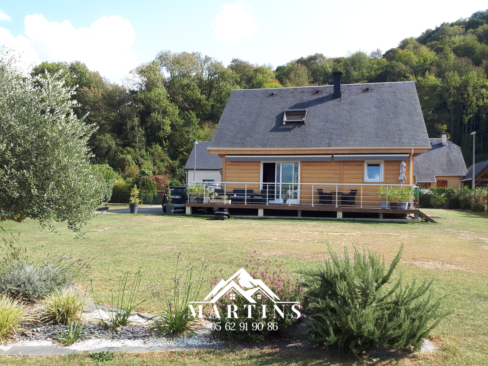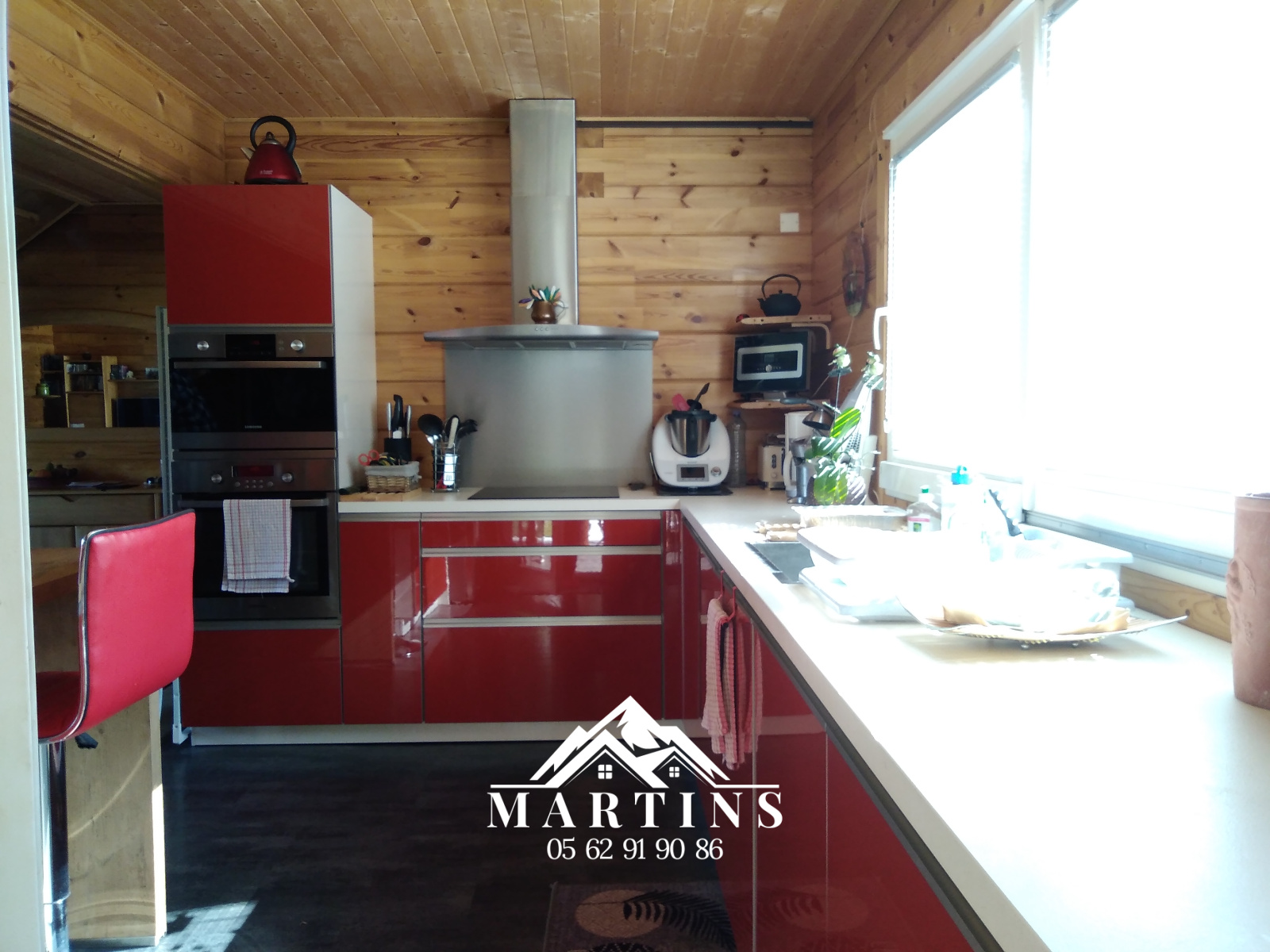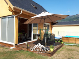 Elle est construite en madriers, isolation laine de mouton, volets roulants électriques, huisseries triple vitrage.