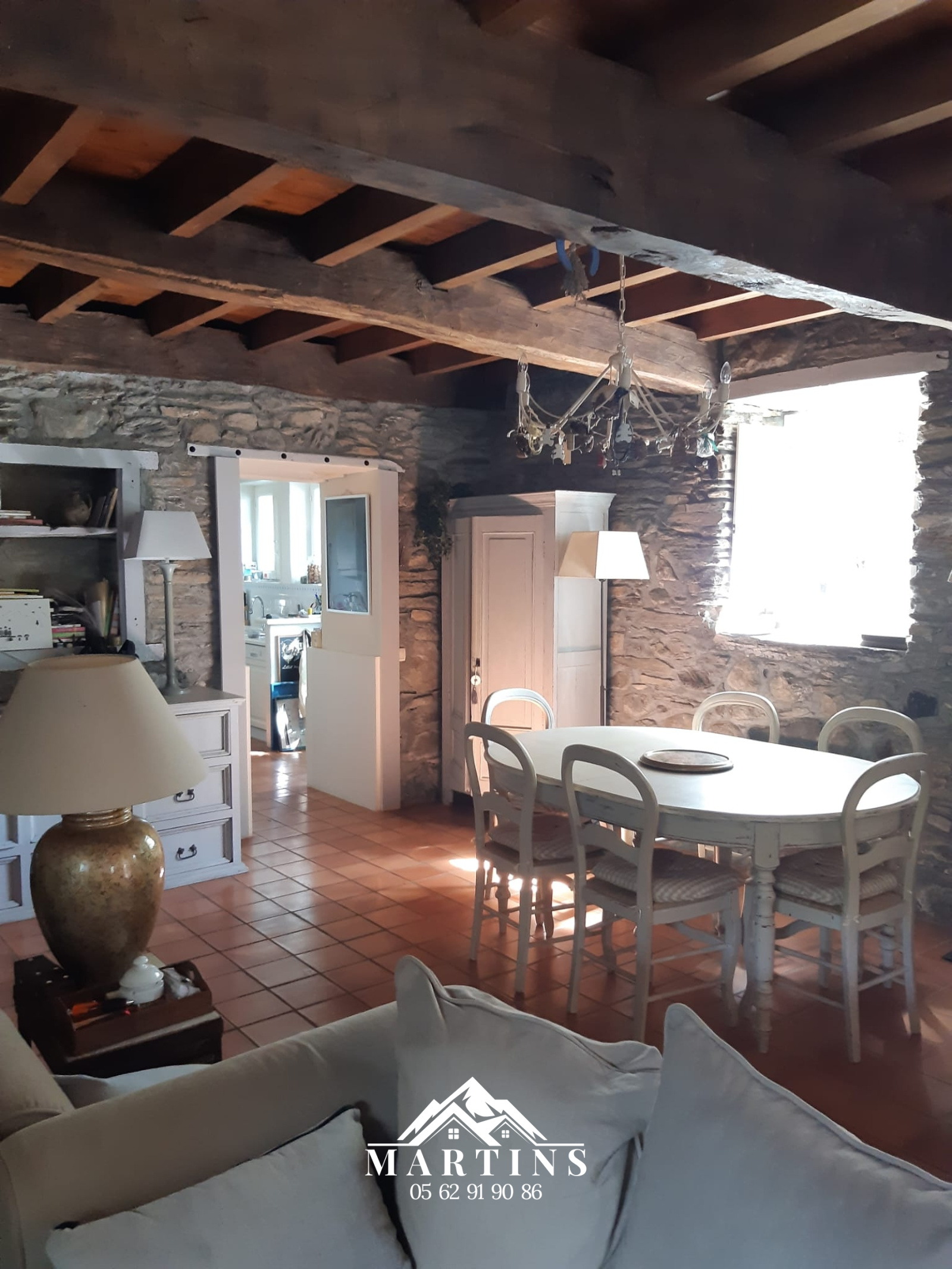 A l'étage : un grand palier /mezzanine/salon (accès terrasse), 3 autres chambres et salle de bains avec WC.
