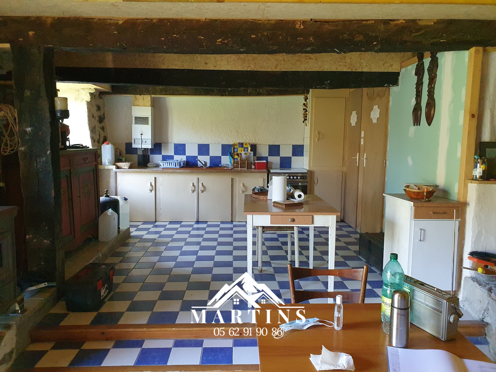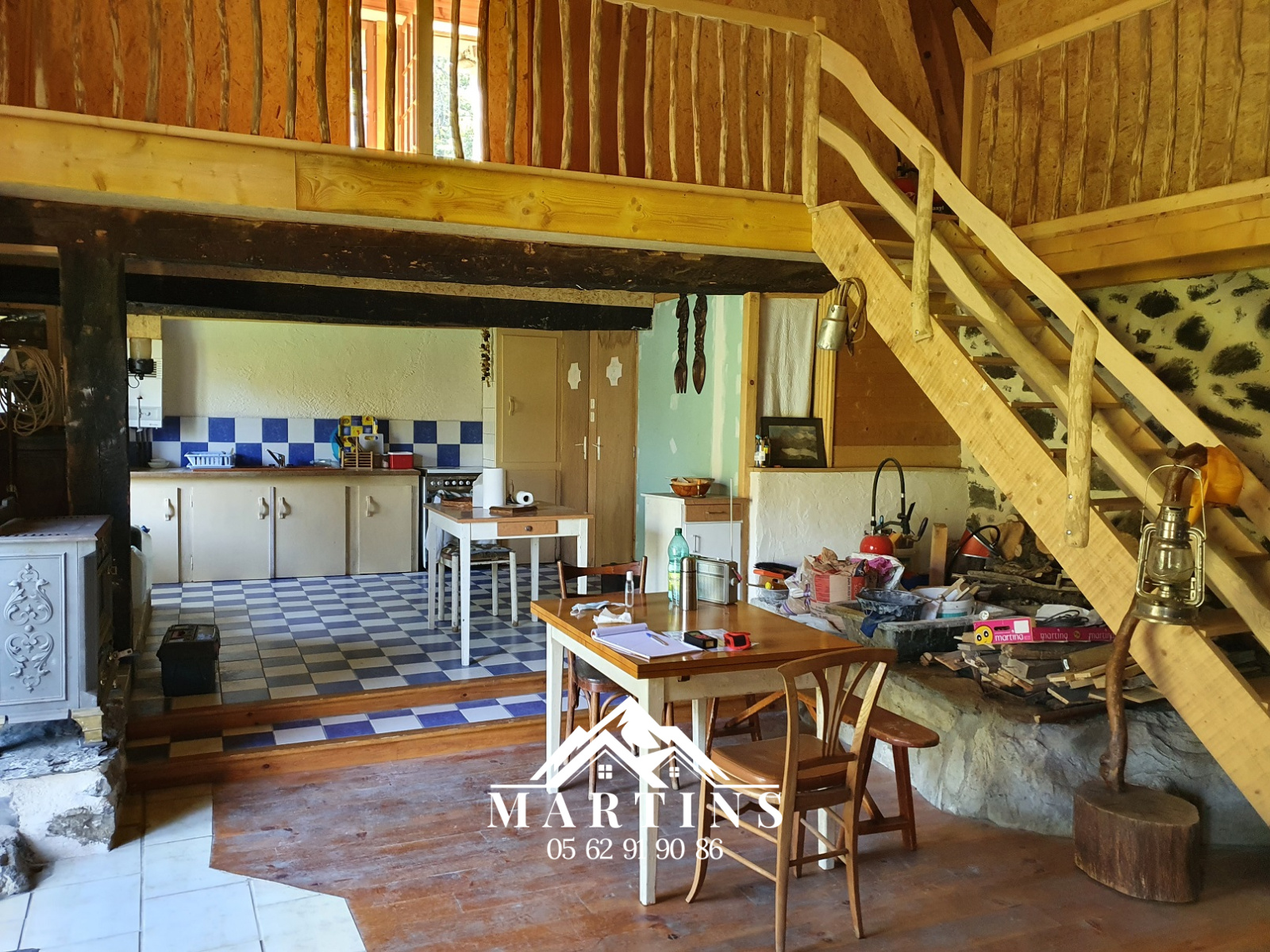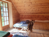 elle a été aménagée il y a un peu plus de 10 ans, elle dispose d'une grande pièce de vie avec coin cuisine, salle d'eau et WC, et dans les combles, un grand dortoir, et une chambre séparée qui a accès sur le jardin à l'OUEST.