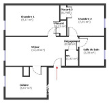Cet appartement de 43 m² habitables comprend : un séjour, une cuisine aménagée et équipée séparée, deux chambres avec placards, une salle d'eau et WC séparés.